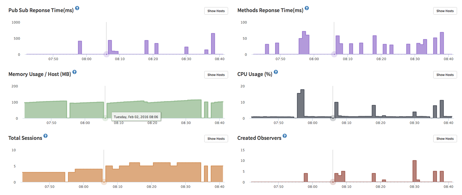 So recently (on friday/saturday) one of our services started crashing pretty randomly, sometimes it holds for an hour, sometimes it crashes after 5 mins. The problem is, that kadira is showing only 100 Mb of memory usage, no spikes in method calls or sub calls.