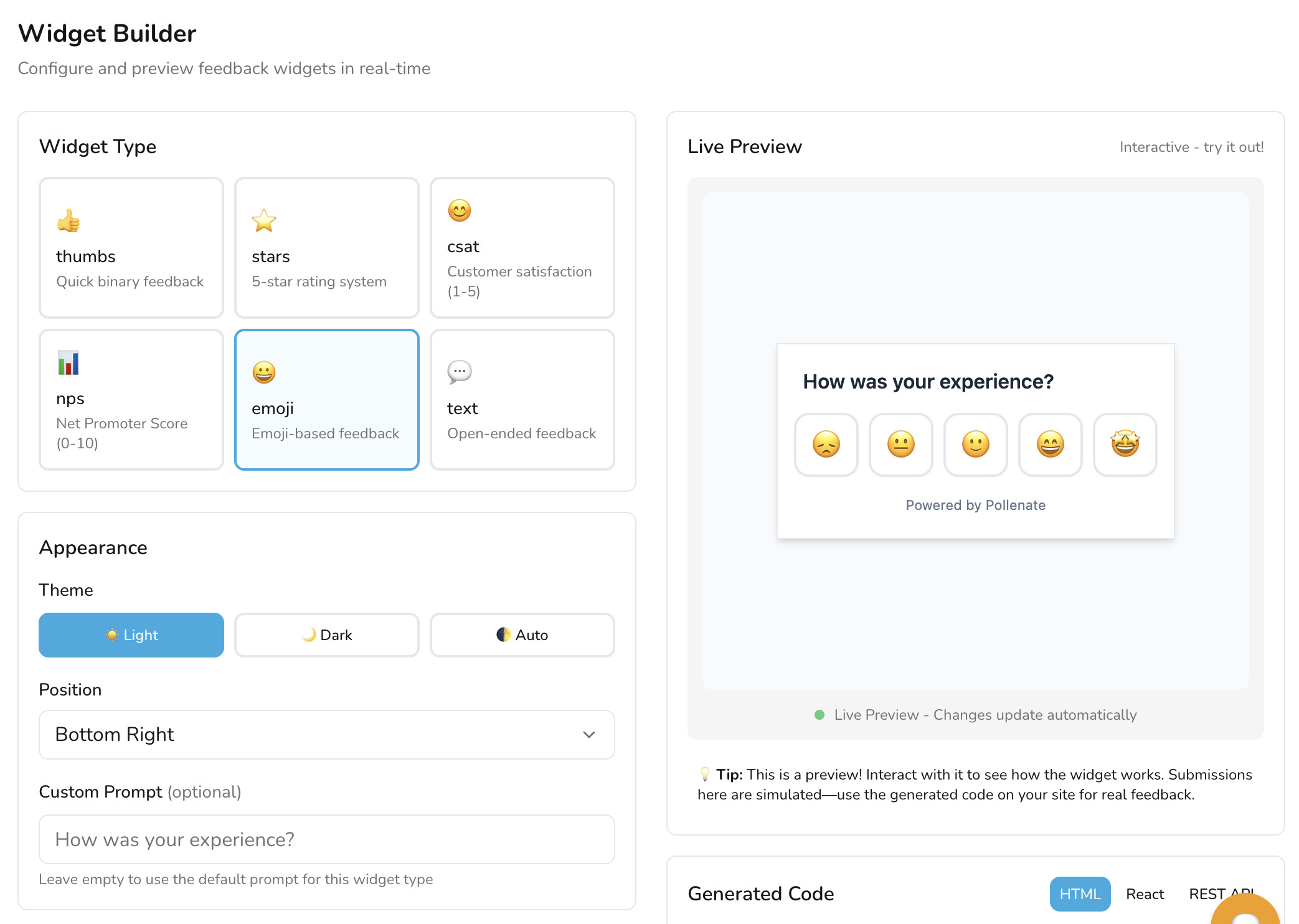 - Widget types: Thumbs, star ratings, NPS, CSAT, emoji, and free text