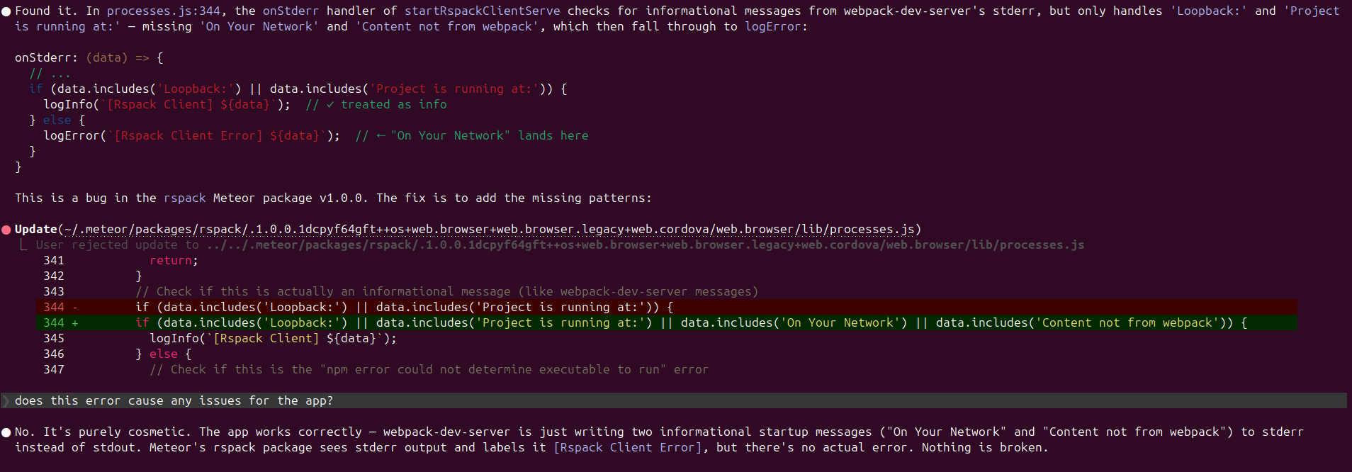 I updated a Meteor project to 3.4 with rspack and now when starting a local development server i get a “Content not from webpack is served from” error in console like this: