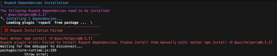 p5s4j 11/18 4:05:28.182 PM e[91me[31mRspack plugin error: Could not find rspack.config.js, rspack.config.ts, rspack.config.mjs, or rspack.config.cjs. Make sure @meteorjs/rspack is installed correctly.e[0m