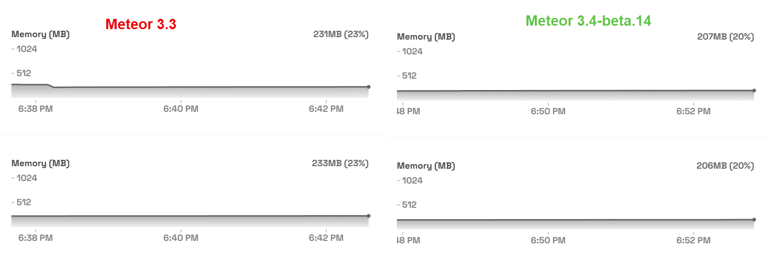 I’ve been able to test the Galaxy app (a real-world production app) migrated to Meteor 3.4-beta.14 with Rspack and check the RAM consumption. On my side, I haven’t seen any increase in RAM usage, actually, I’m seeing lower RAM usage on the live data graphs.