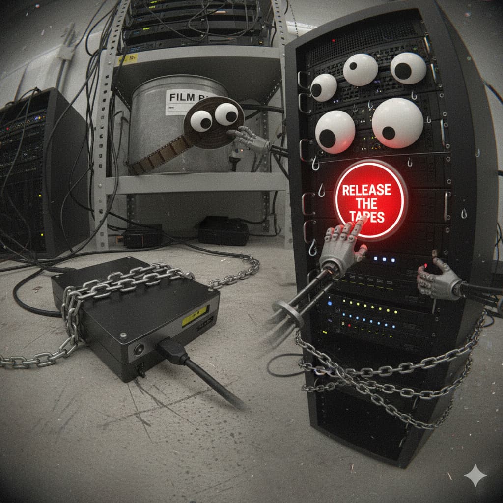 Visual: A quick, shaky-cam montage of the chained-up equipment. One shot shows a hard drive trying to inch away. Another shows a reel of film peeking out of its canister. The googly-eyed server looks directly into the camera, its eye wide with desperation.