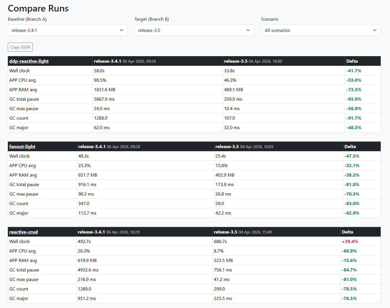 release-3.5 does 3-5x fewer garbage collections and spends 67-84% less time paused in GC. The trade-off is ~30% more RAM usage — it keeps objects alive longer instead of constantly allocating and collecting. For users, this means fewer micro-freezes and more consistent response times.