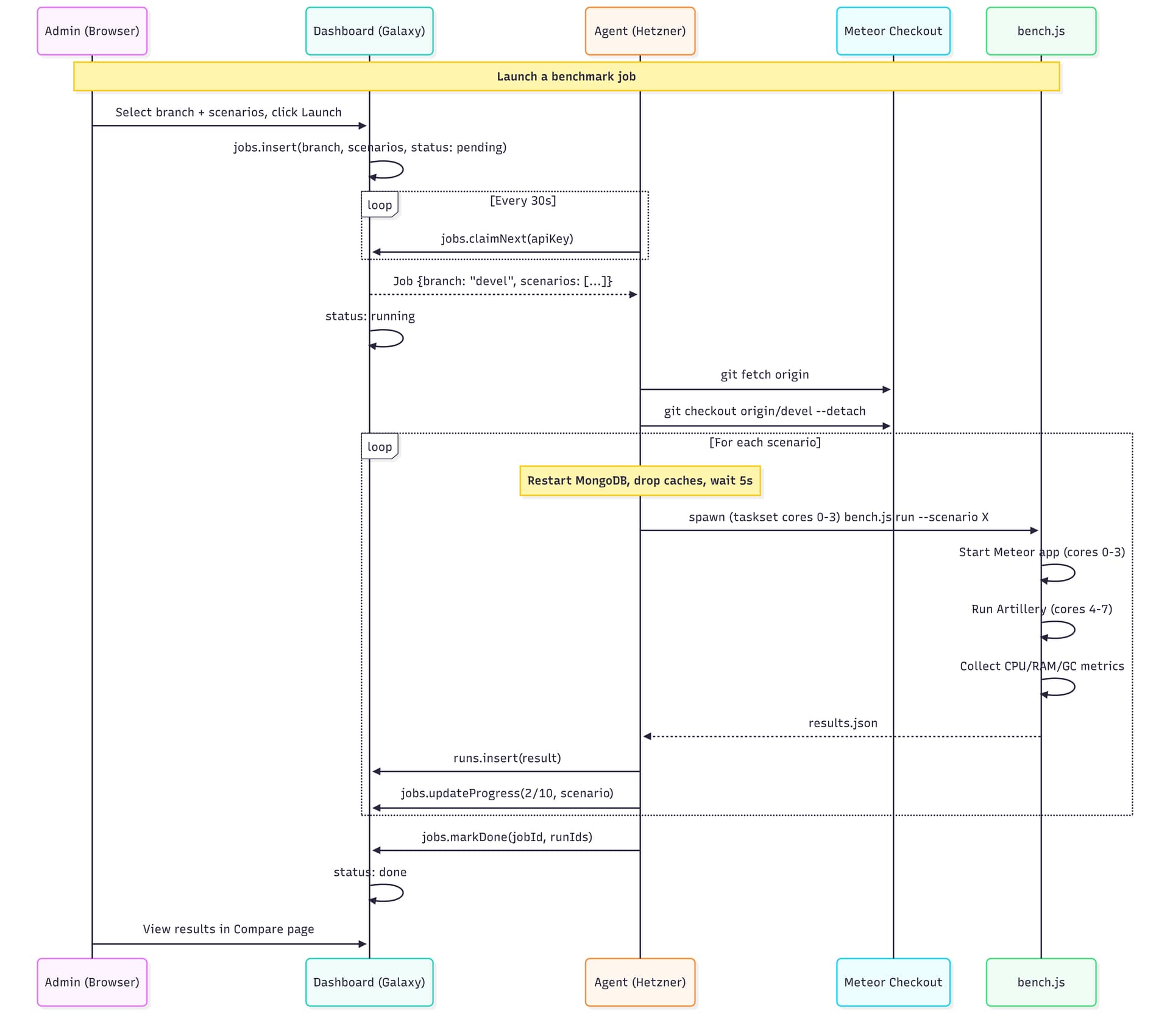 The agent polls every 30s, picks up pending jobs, runs them sequentially, and pushes results back. There’s an admin page where you can select a branch from a dropdown (synced from the Meteor repo — all 1,900+ branches), pick scenarios, and hit launch.
