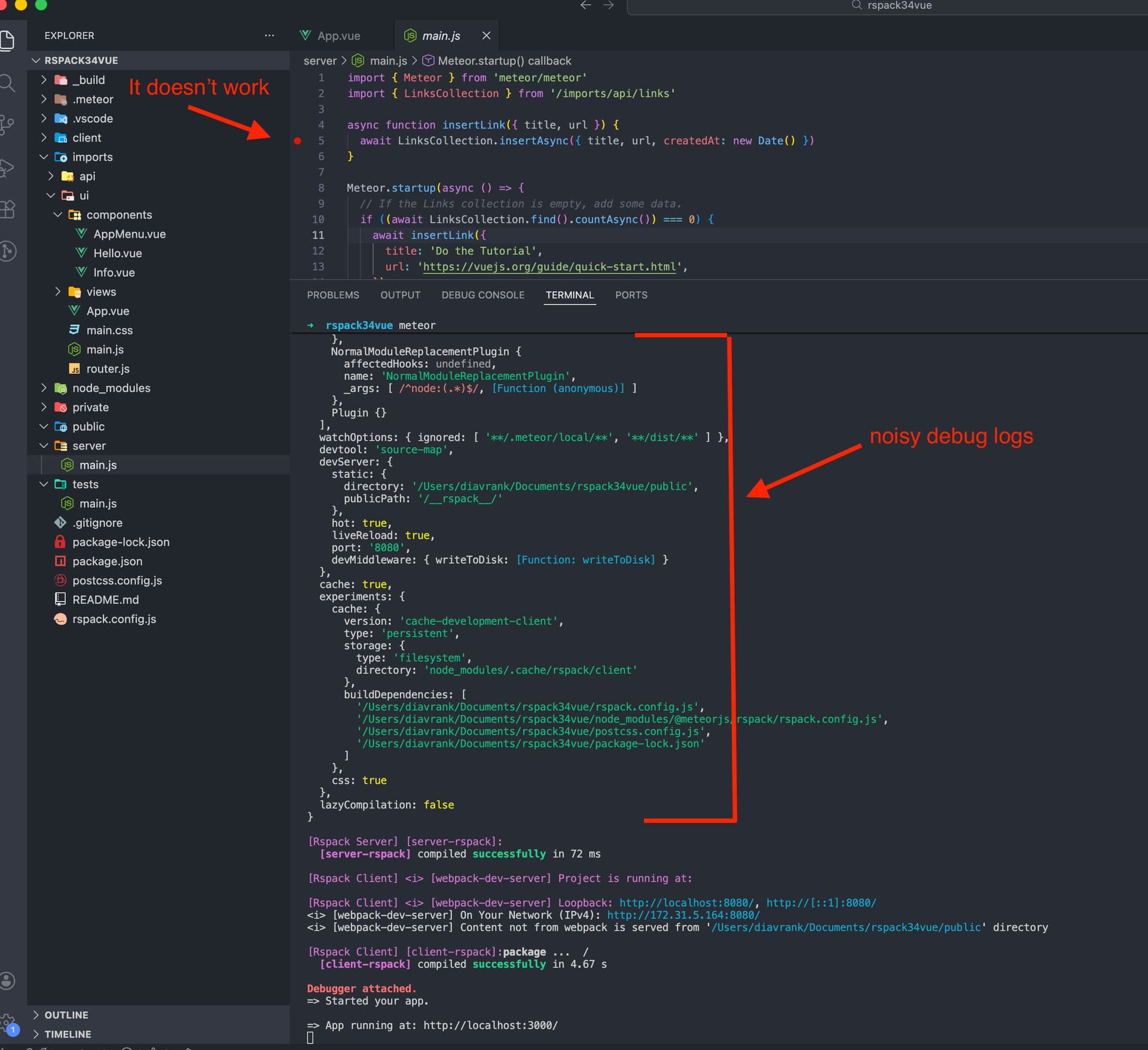 If yo create a meteor app that donāt uses rspack (e.g. meteor create meteorvue --vue), it works. Here is the evidence: