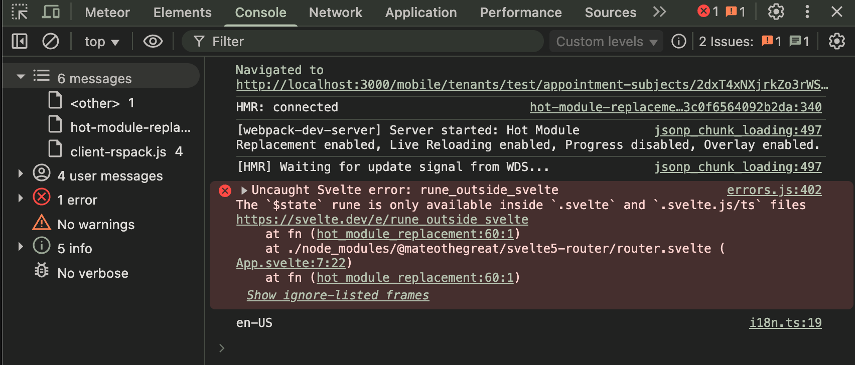 Hello again, I wanted to share a problem I encountered and its solution. I was using tinro5 in my project. I wanted to use a more up-to-date router. For this, I switched to @mateothegreat/svelte5-router. During the transition, I encountered the error shown in the image. My project didn’t have any $state outside of .svelte files. However, the package contained files with the .svelte.js extension. To resolve this, updating the rspack.config.js file was sufficient.