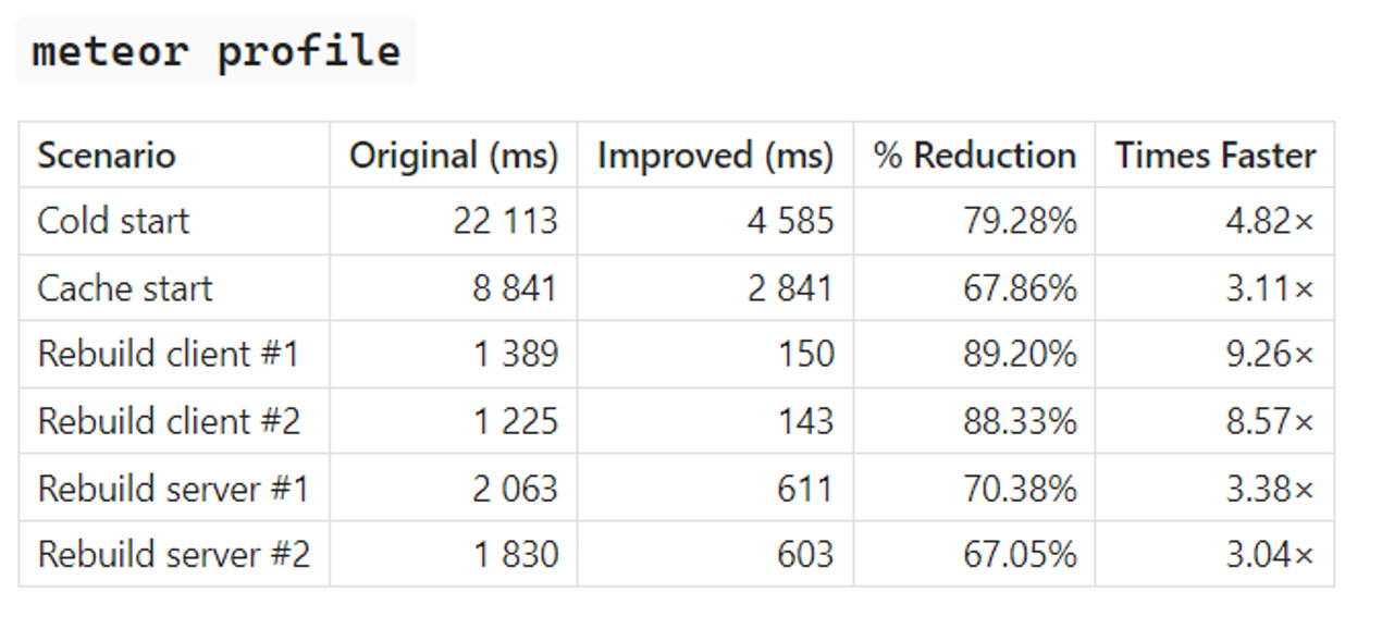 Meteor 3.4 goes further than Meteor 3.3 and the initial SWC adoption. With Rspack now compiling your app code, you get the speed of this modern tool built in Rust. The Meteor bundler still compiles Atmosphere packages and links the final app code, but that part was already optimized in Meteor 3.3, so you get the best of both.