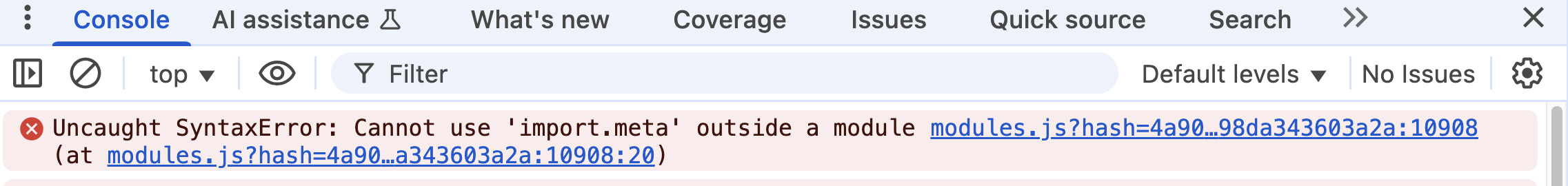 Uncaught SyntaxError: Cannot use ‘import.meta’ outside a module (at modules.js?hash=81d9f1b41933efc36c207594a7a96b81aa72a01a:26920:20)