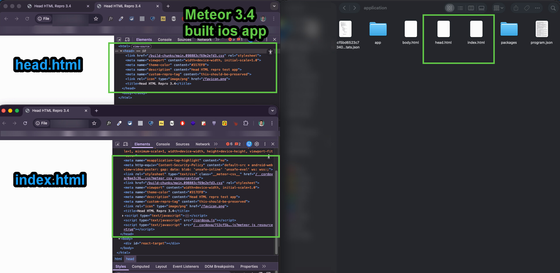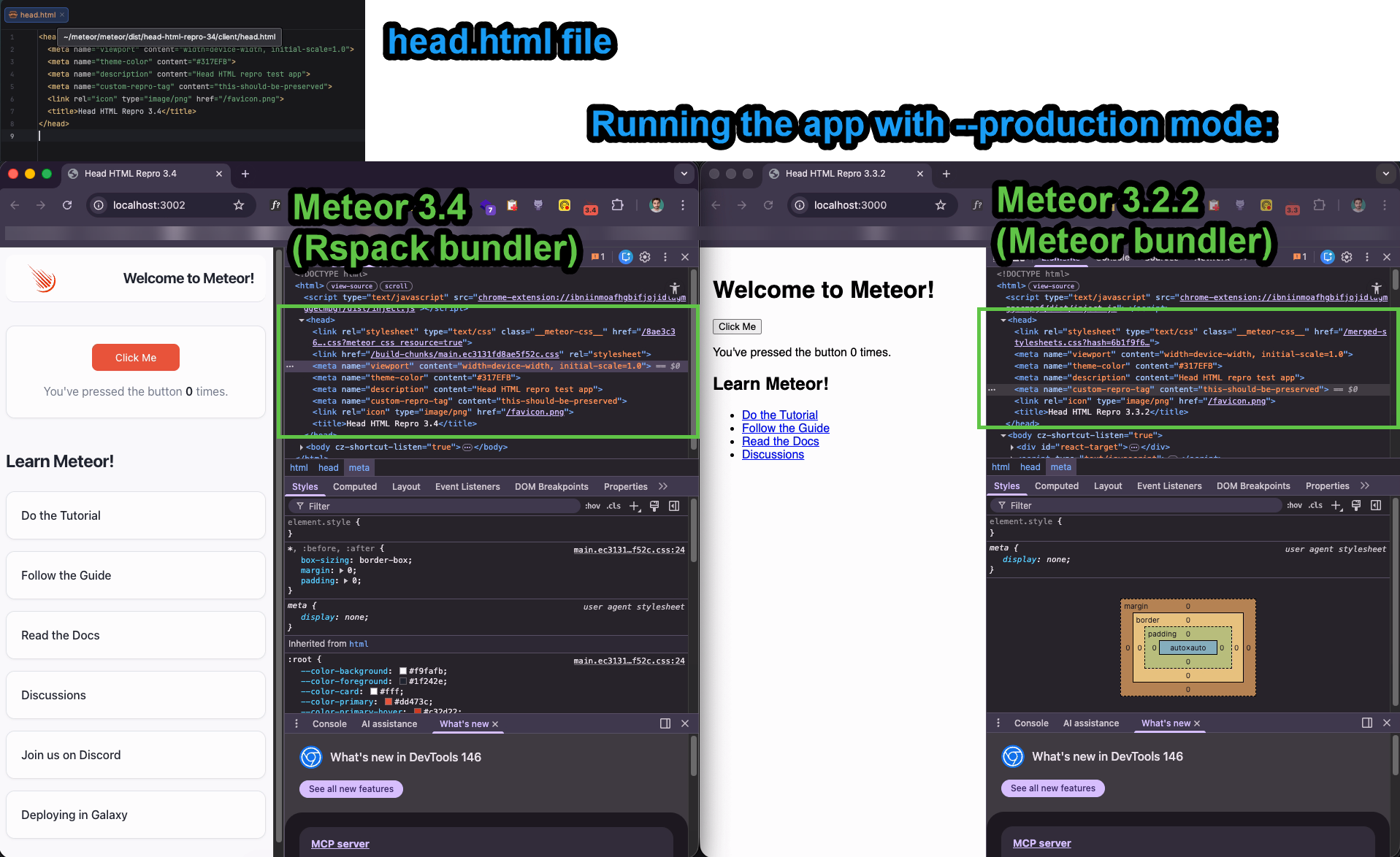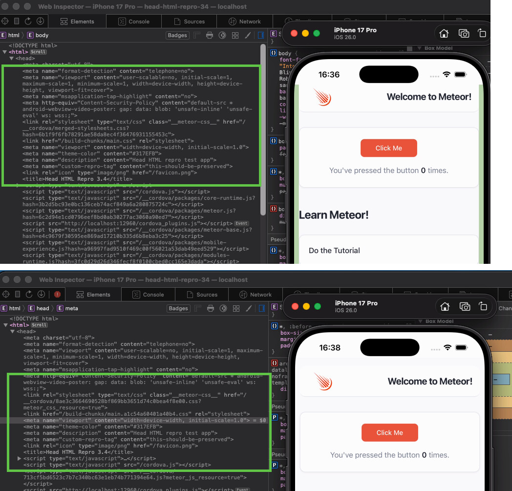 I consistently get the client/head.html contents. This issue may be related to a specific edge case in your app setup. I’d love to help, but I need a minimal reproduction repository for the issues you report, just like with others I was able to confirm and fix quickly all them for next Meteor 3.4.1 within modern-build-stack label. Ideally, we could track them within the repository issue section with proper reproduction steps.